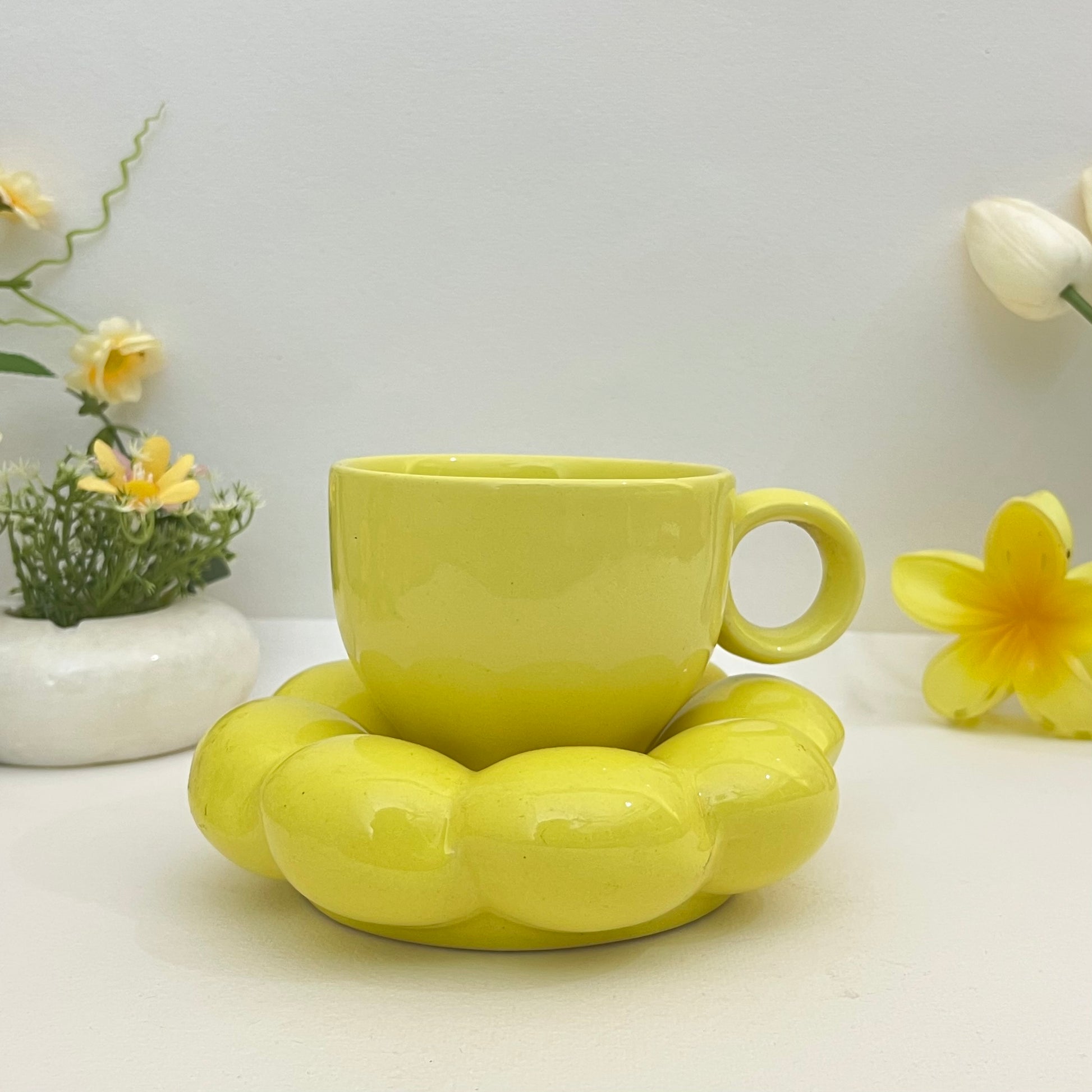 Expertly crafted with high-quality ceramic, this Bubbly Mug with Saucer in Yellow is a must-have for your morning routine. The unique bubble shape of the saucer adds a touch of elegance to your beverage presentation. Perfect for tea or coffee, indulge in a Pinterest-worthy experience with this charming set.