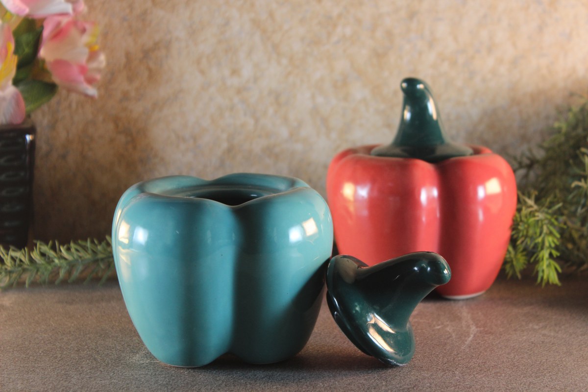 Add a pop of color and functionality to your kitchen with our Capsicum Ceramic Jars - Set of 2. These vibrant red and sea green jars are perfect for storing spices, sugar, tea, or any other knick-knacks you may have around the kitchen. These ceramic handcrafted jars are a beautiful and unique addition to any countertop or shelf, adding a touch of artistry to your home decor. Each jar is expertly crafted with intricate detailing, making them a standout feature in any space. Whether used for storage or simply as a decorative piece, these Capsicum Ceramic Jars are a charming and practical addition to any home.