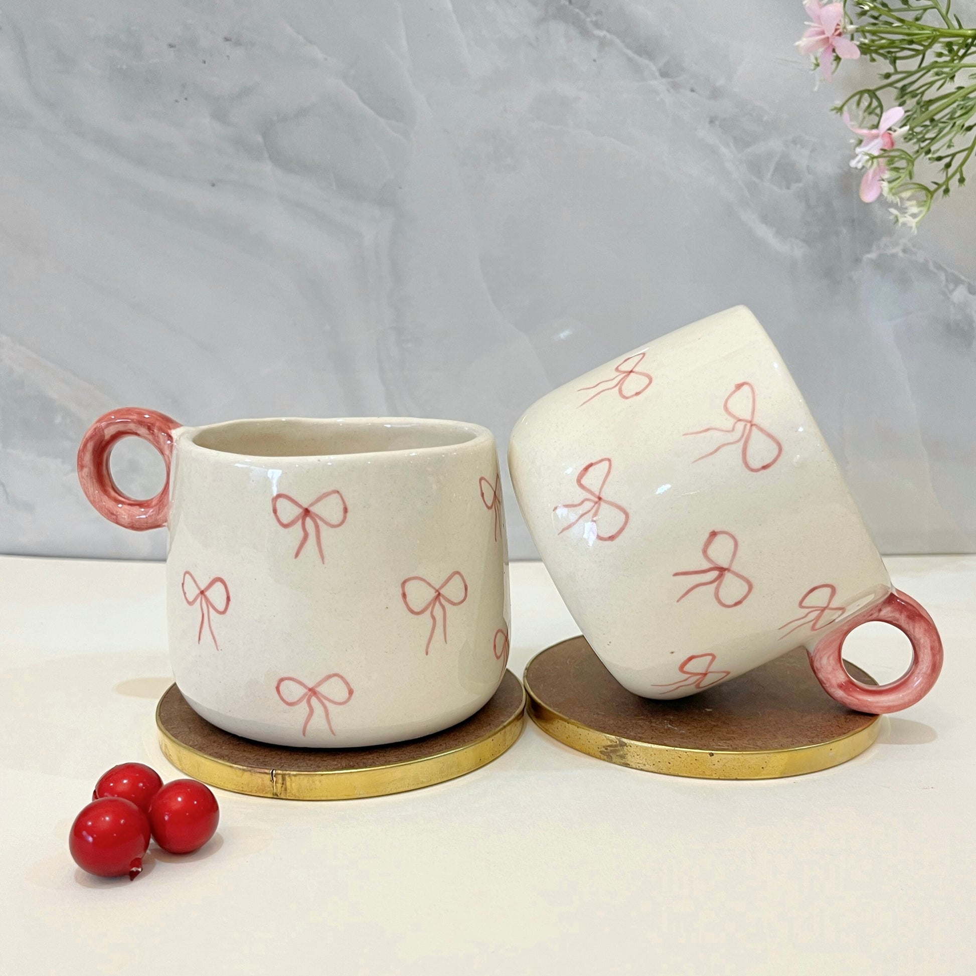 This ceramic bow mug is handpainted for a unique and elegant touch. Add a touch of Pinterest-worthy aesthetic to your morning coffee routine. Crafted with high-quality ceramic material, this mug is both functional and visually appealing. Upgrade your collection with this charming piece