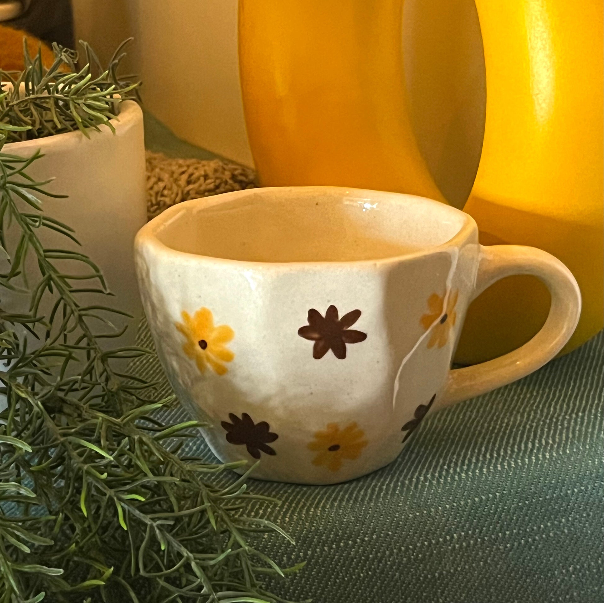This beautiful ceramic mug features a hand-painted sunflower design, crafted with care by skilled artisans in India. Enjoy your morning cup of coffee or tea with a touch of elegance, knowing your purchase supports traditional craftsmanship. Made to last and add a unique touch to your home decor.