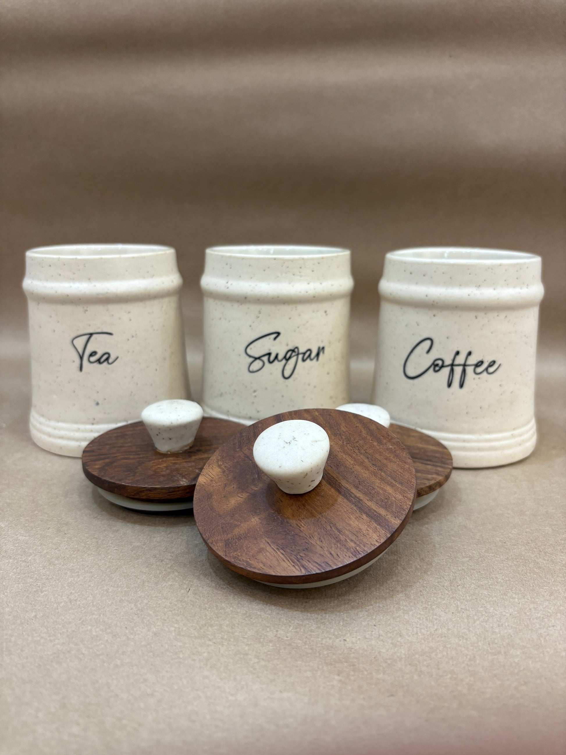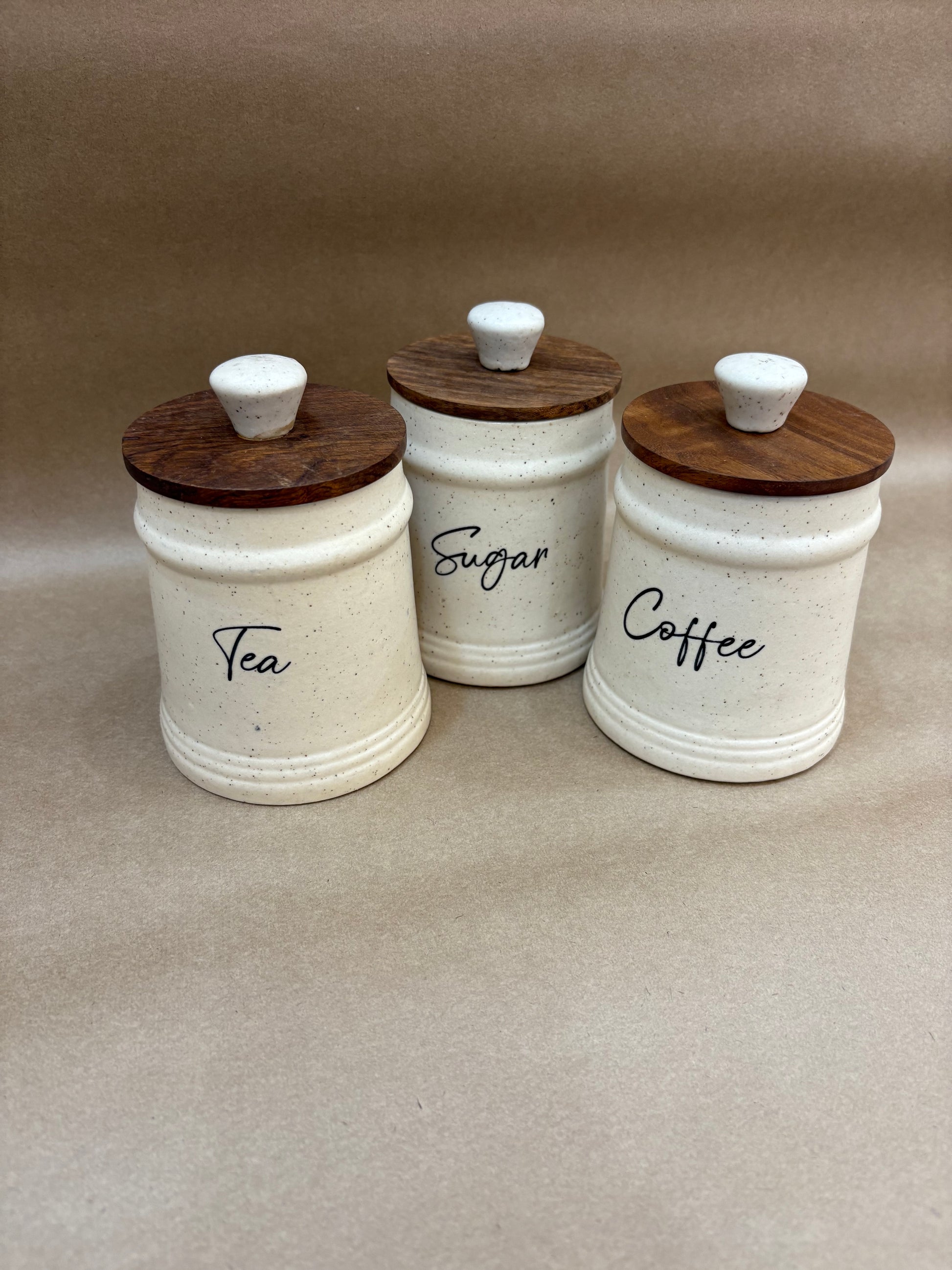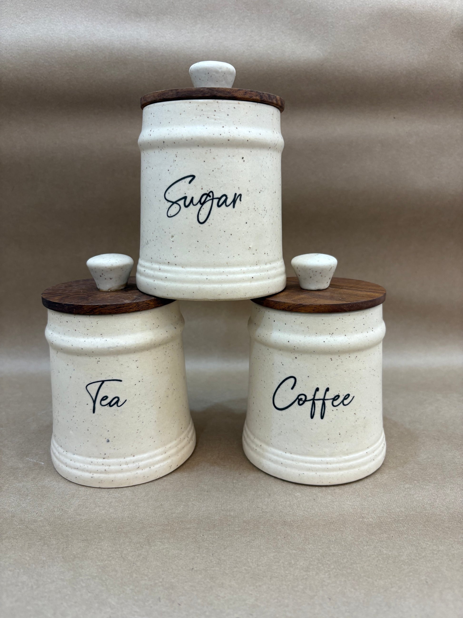 Organize your kitchen in style with our handcrafted ceramic jar set for Tea, Sugar, and Coffee. Featuring a minimalist speckled finish and natural wooden lids with ceramic knobs, this trio adds charm and function to any countertop. Airtight and easy to use – perfect for everyday essentials.