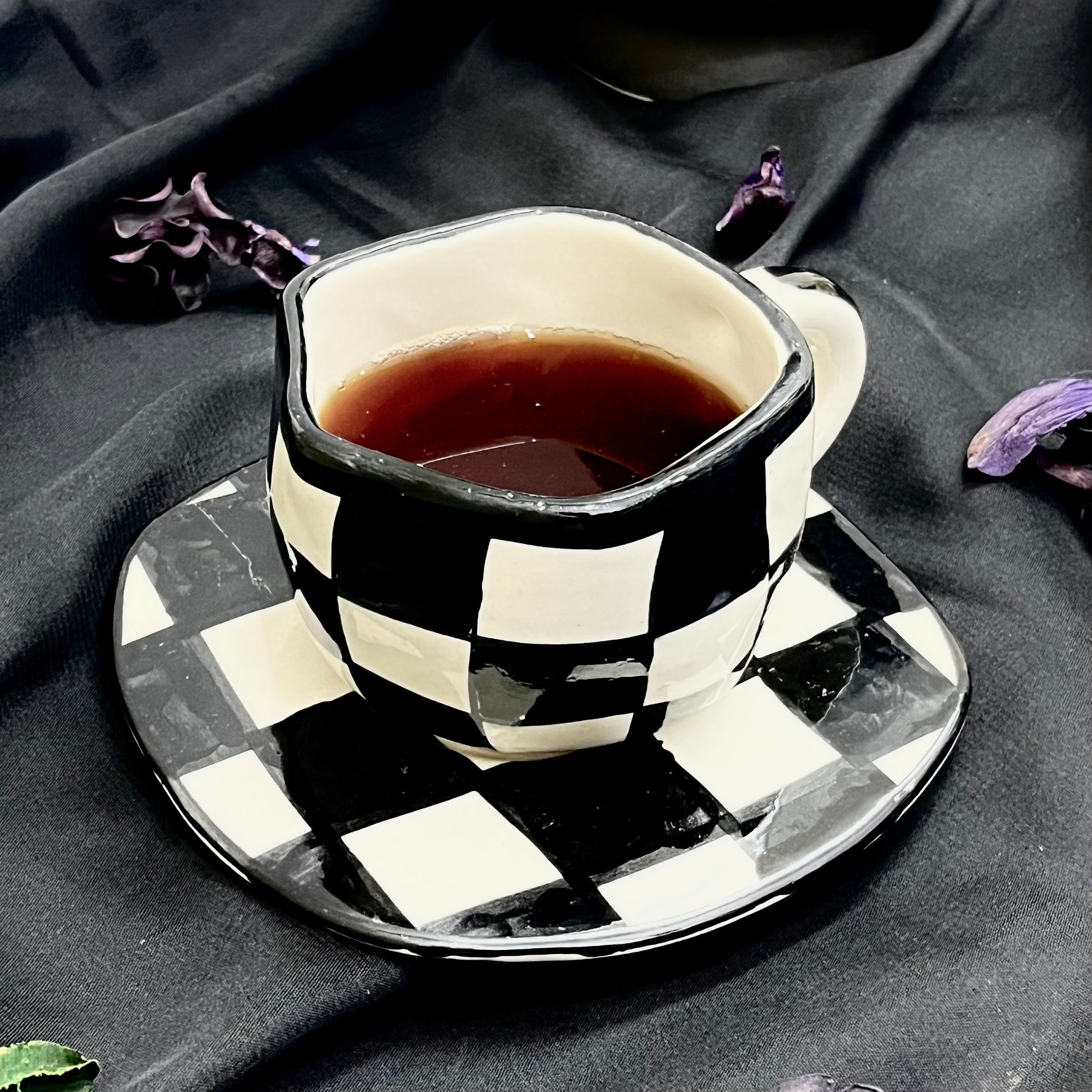 Elevate your tea time with our Checkmate-Ceramic cup and saucer set. Hand painted with black and white checks, this elegant set adds a touch of sophistication to any table setting. Enjoy your favorite hot beverage in style and impress your guests with this beautifully crafted set.