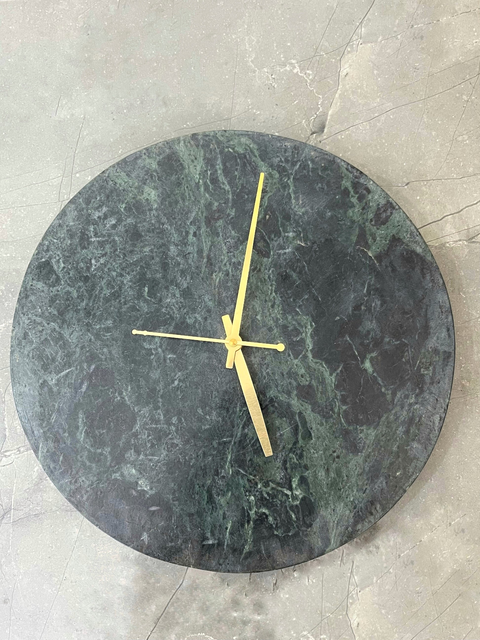 Expertly crafted from natural green stone marble, this wall clock adds a touch of elegance to any room. The golden hands effortlessly glide over the hand made, textured surface, making it not only a functional timepiece but a true work of art. Timekeeping has never been more beautiful.