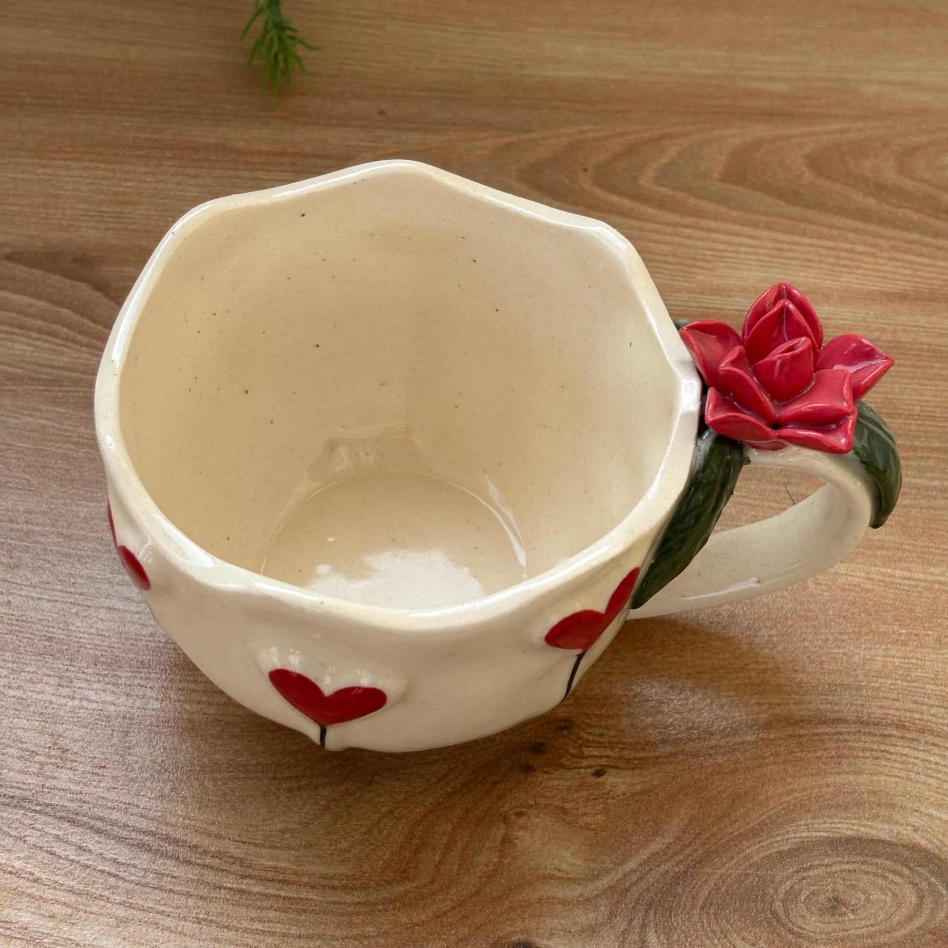 The vintage-inspired cream glaze, paired with red heart accents and a sculpted floral handle, adds a touch of romance and elegance. Whether you're looking for a Valentine’s Day mug, an anniversary gift, or a cozy cottagecore aesthetic piece, this mug is both functional and decorative