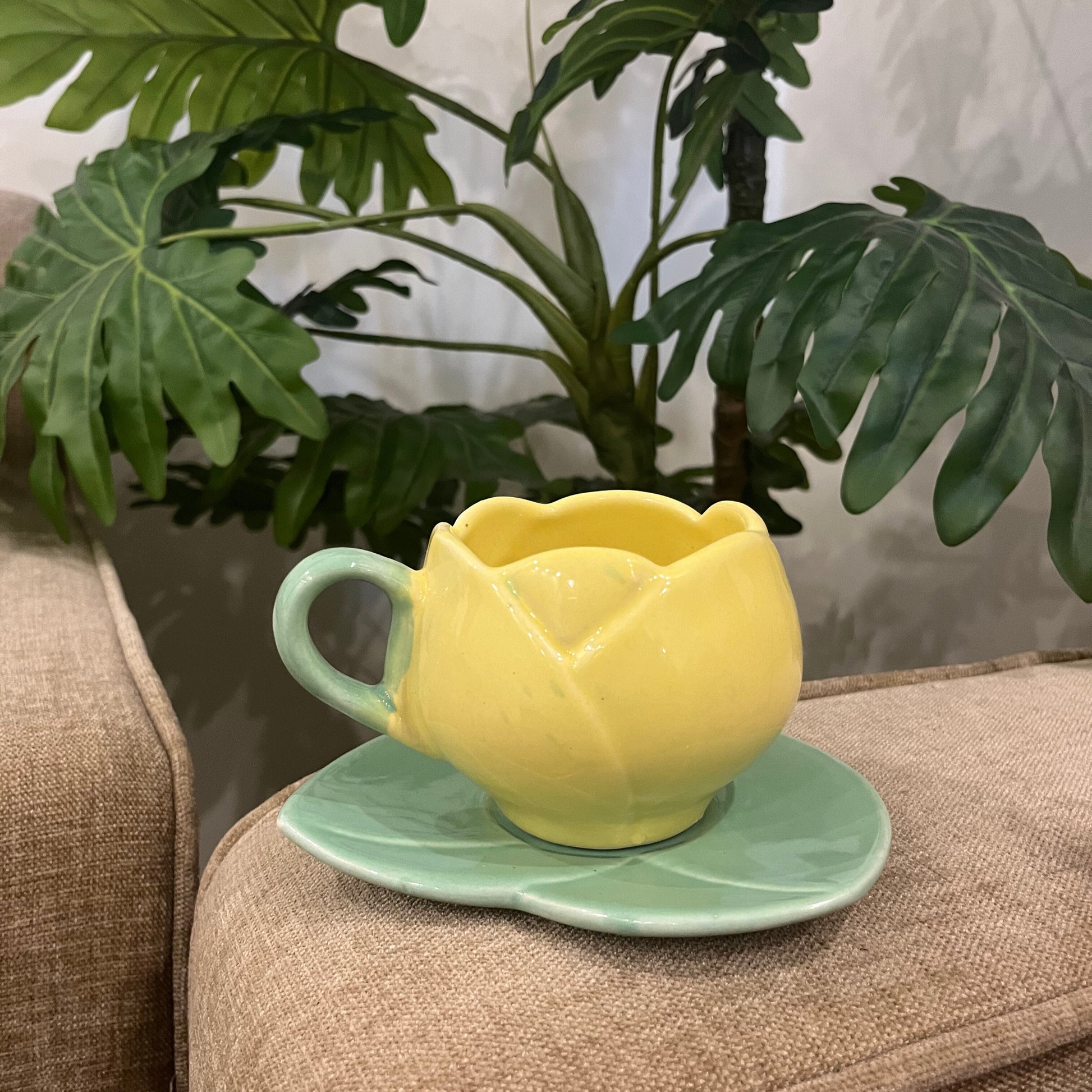 Expertly hand crafted, the SUNLIT Yellow Lotus Mug is an aesthetic addition to any kitchen. Its unique lotus shape comes with a matching saucer and a cheery yellow color. Each mug is one-of-a-kind, making it a perfect display piece for any tea lover.