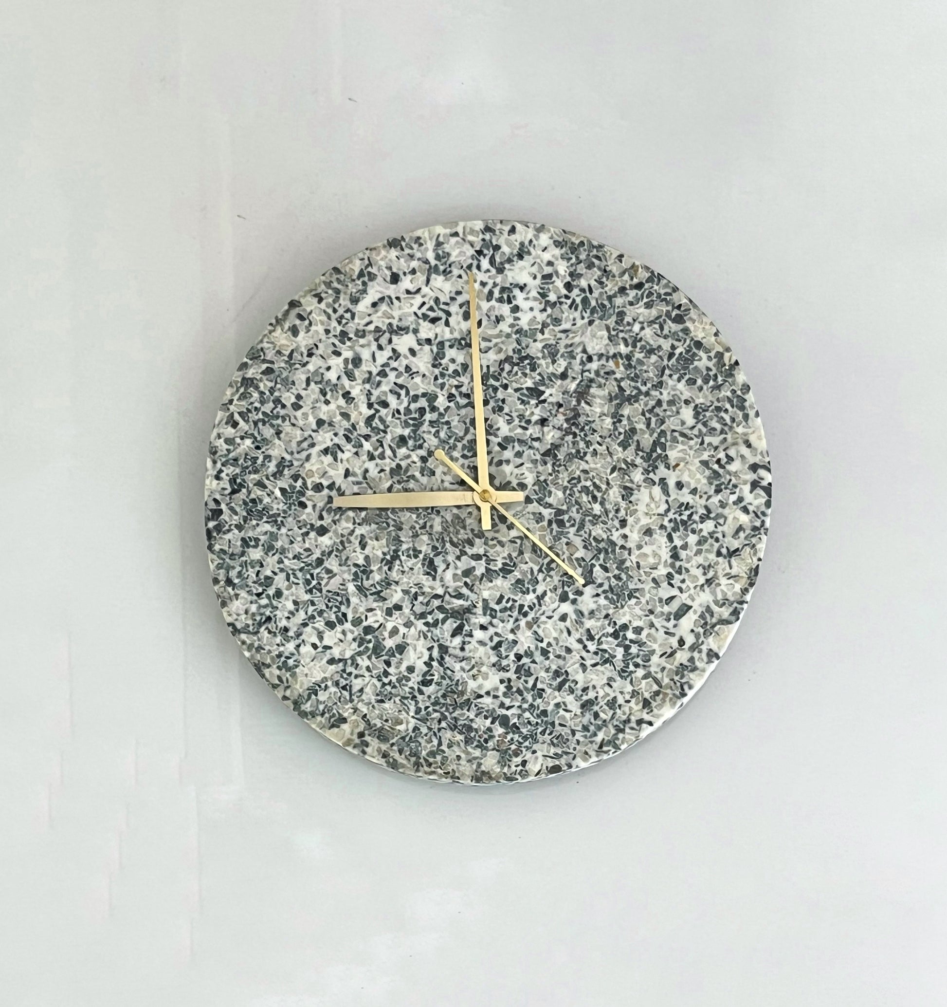 This elegant Terrazo wall clock is a hand-crafted piece that adds sophistication to any space. The intricate design features a mix of white and black, with gold hands adding a touch of luxury. Handmade with expert craftsmanship, this wall clock is a must-have for any interior design enthusiast.
